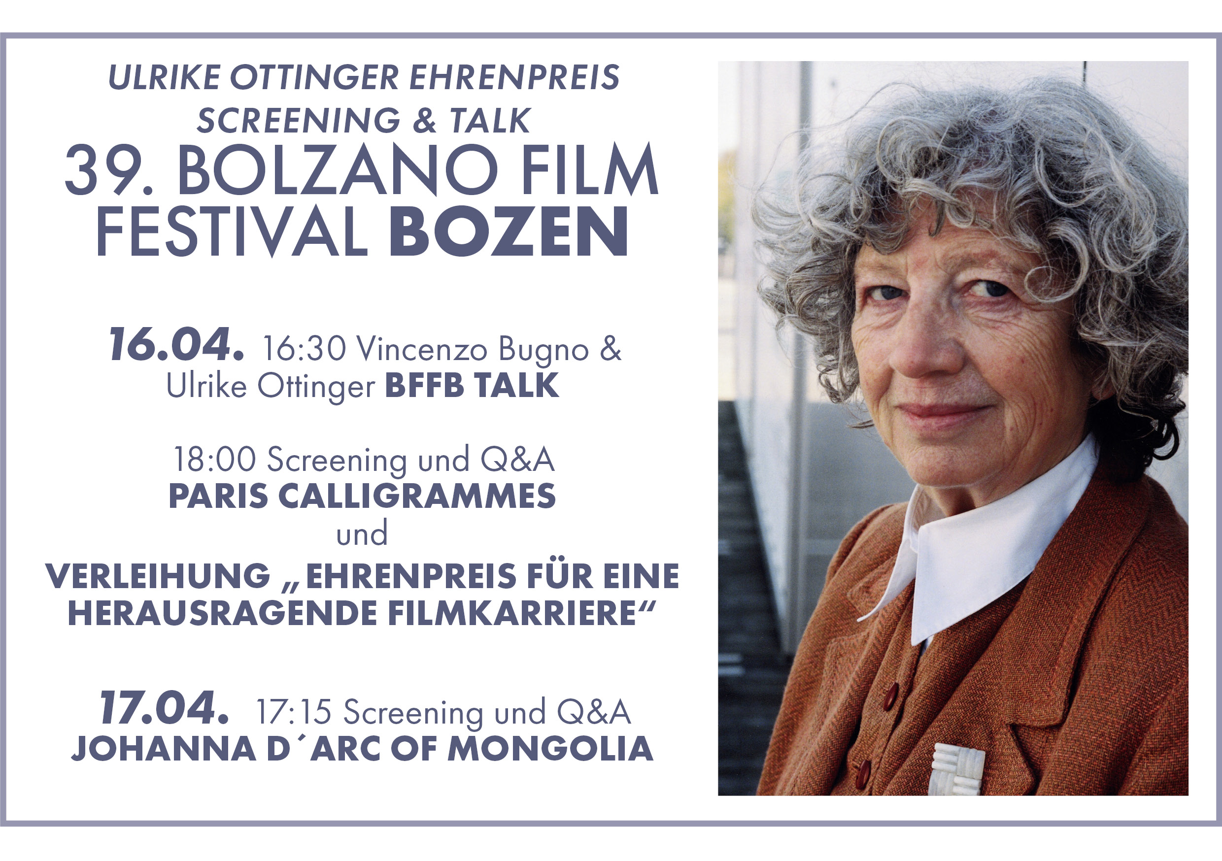 Die Verleihung der Berlinale Kamera an Ulrike Ottinger fand am Samstag, dem 22. Februar, um 16:15 Uhr im Haus der Berliner Festspiele statt. Danach wurde die Weltpremiere von Ottingers Dokumentarfilm Paris Calligrammes als Beitrag im Berlinale Special präsentiert.