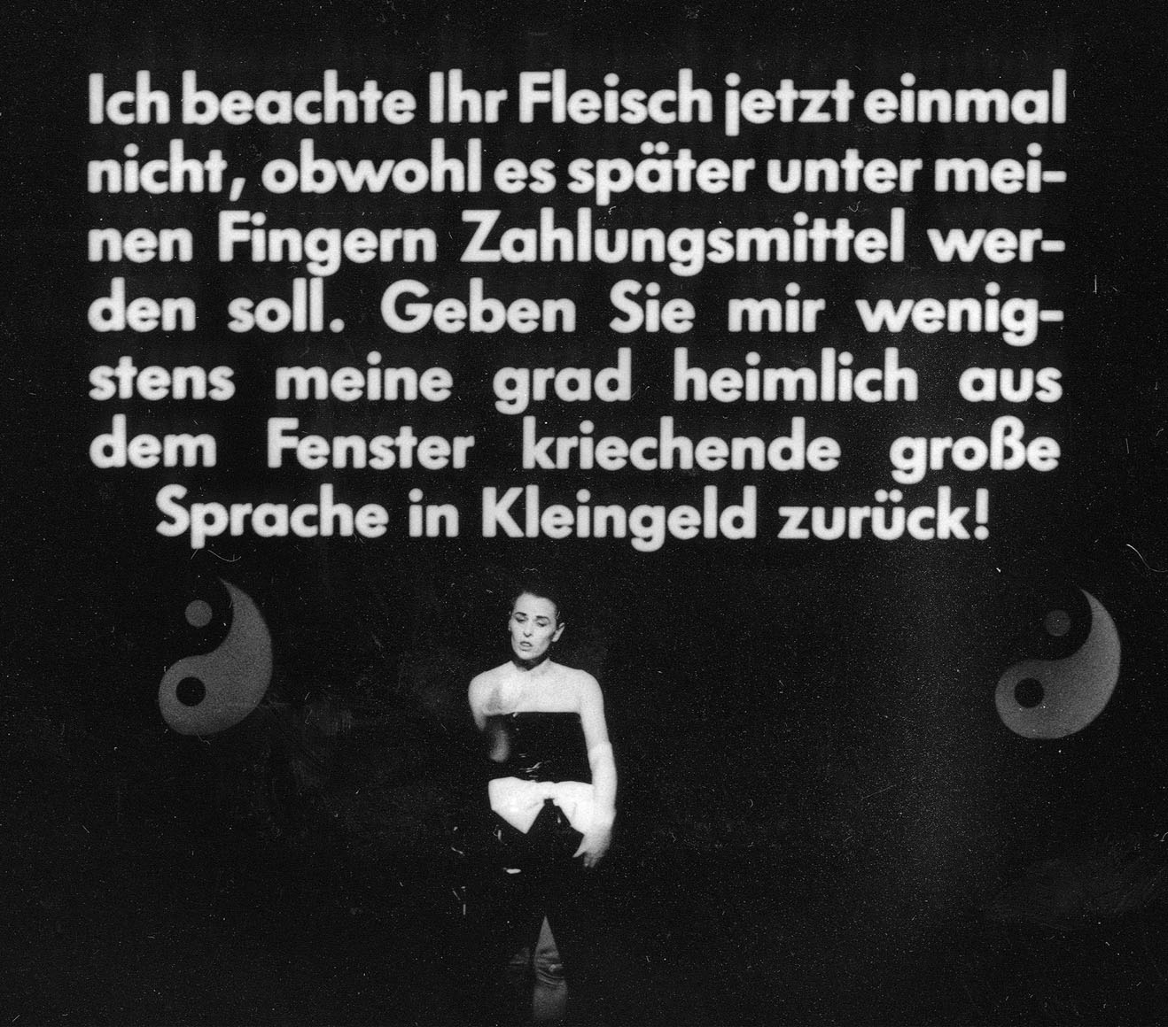 Auf der Leinwand im Hintergrund der Spielfläche wird, Satz für Satz, die Textur von Elfriede Jelinek eingeblendet, in der kaum ein Satz nur ein Satz ist.
