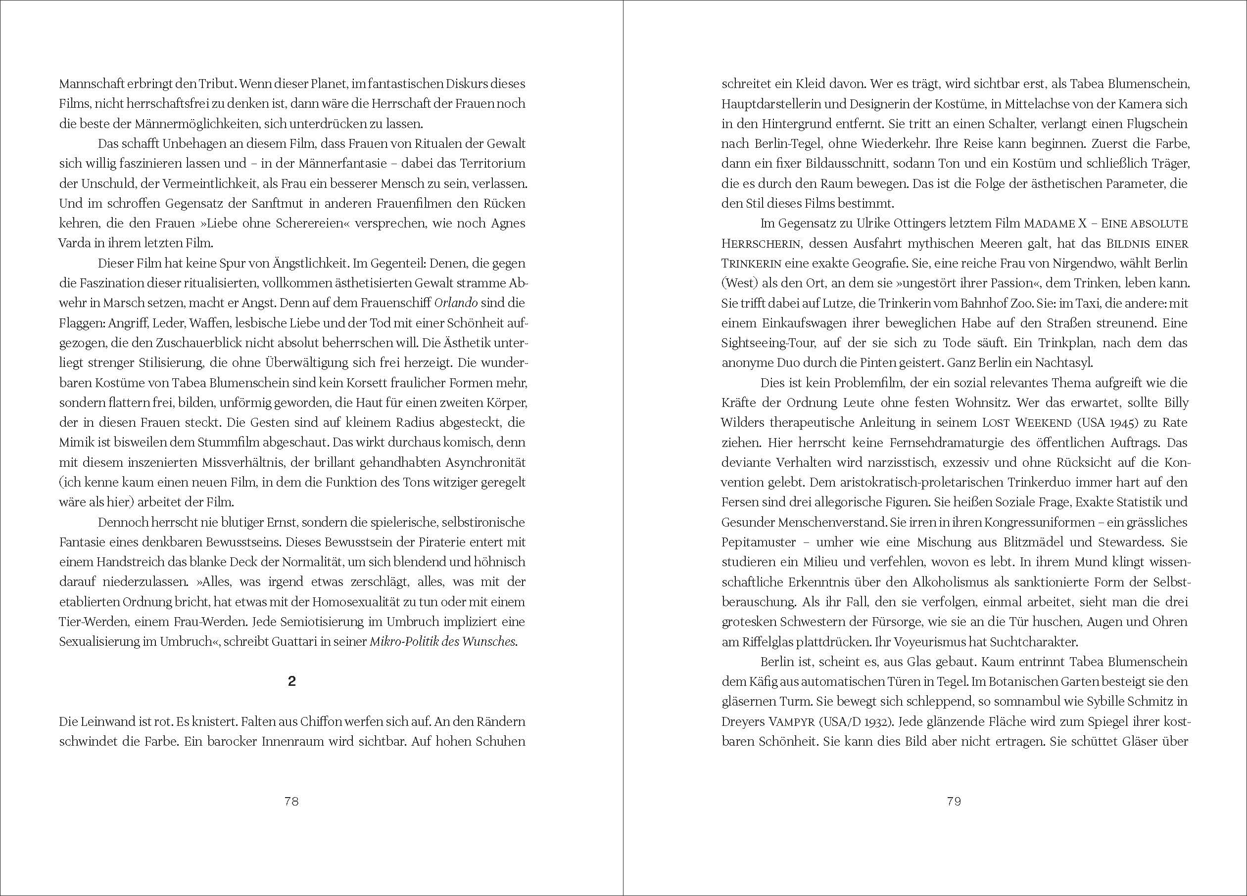 Ulrike Ottinger ist seit Beginn der 1970er Jahre eine Pionierin des Queer Cinema, das Positionen des Frauen- und Feministischen Films theoretisch, bildpolitisch und ästhetisch ausdifferenziert hat. Schon ihr Film Madame X. Eine absolute Herrscherin (1977) avancierte in den US-amerikanischen wie europäischen Kinos, den universitären Filmklassen und queeren Subkulturen zu einem Kultfilm. Es war der Beginn einer bis heute anhaltenden, intensiven cineastischen wie filmtheoretischen Wechselbeziehung zwischen Deutschland und den USA. Mit Ottingers Spielfilmen (der Berlin-Trilogie: Bildnis einer Trinkerin, Freak Orlando und Dorian Gray im Spiegel der Boulevardpresse, sowie Johanna d’Arc of Mongolia), die durch ihre narrative Imagination und formale Radikalität die Konventionen des Art House Kinos sprengten, und mit ihren ethnologischen Dokumentationen, deren Langzeitformate und poetische Narrative einen Gegenpol zu den Kurzformen der digitalen Medien setzten, erweiterte sich das Spektrum ihrer Zuschauerschaft auf beiden Kontinenten: Debatten um die Potenziale des Bewegtbildes als historiografisches Medium wurden durch ihre Filme ebenso angestoßen wie postkoloniale Diskussionen um die ›Begehbarkeit der Welt‹.