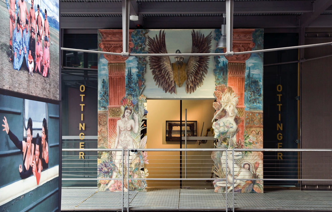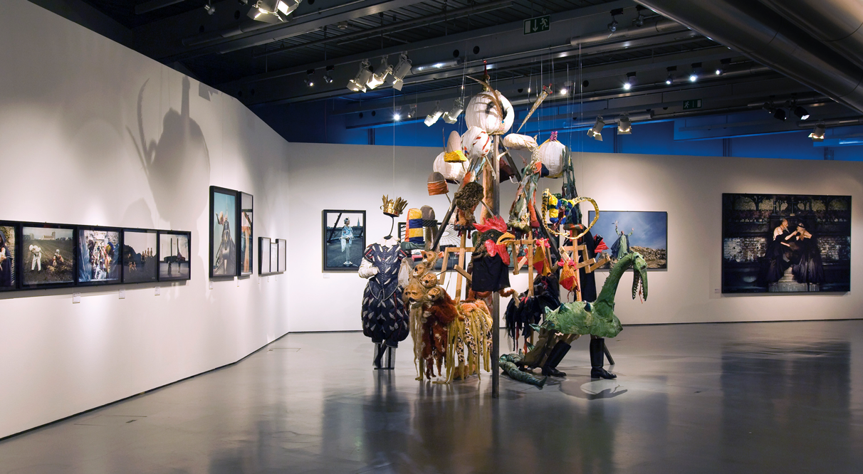 The exhibition began for visitors as soon as they entered the lift, which conveyed them Through the high, glazed foyer past a long banner showing photographs from the films as though on an oversized strip of celluloid. It showed works from Ottinger´s earliest period onwards: photographs, costumes, scripts and sketchbooks presented in near chronological order and in numerous rooms. The first was dedicated to works relating to Ottinger's Berlin trilogy: a completely white room with a "pyramid of hats" at its centre, an ensemble of hats and props from almost all of the films. Having passed under the illuminated letters of Freak City in a green corridor, visitors arrived at a red room with photographs relating to the film China. The Arts - The People, then a saffron yellow Mongolian room with assemblages of costumes and photos created in the context of the films Johanna d´Arc of Mongolia and Taiga. " A feast for the eyes - but alos eloquent witness to Ulrike Ottinger´s ability to combine her visual treasure-hunting with thoroughgoing ethnographic and art historical studies."