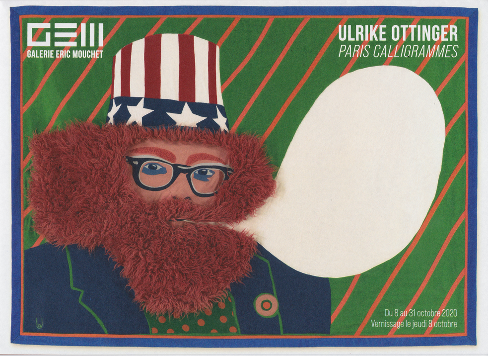 The path woven of images, archives and contemporary shots of Paris sometimes appears to take on the postcard allure of the Saint-Germain-des-Prés life: the bustle of cafés and clubs, the constant flow of visitors into the Cinémathèque française at Chaillot, which sets off Ottinger’s interest in cinema, the classes taught by Bourdieu, Lévi-Strauss and Althusser at the Sorbonne, the empty rooms of the Gustave Moreau Museum and the Louvre’s treasures. Yet ambivalence reigns, in the image of this time of contradictions. After World War II, optimism and progress seem to have no limits. The technical innovations revolutionize domestic interiors and the limits of the known world. Consumption is encouraged by happy, colorful ads. Yet, the world is agitated by conflicts linked to de-colonization. The Evian Agreements ending the Algerian War are signed the year of Ottinger’s arrival in France. She sees in the remains of the Garden of Tropical Agriculture’s pavilions, at an auction at the Hôtel Drouot or in the hair salons of the Faubourg Saint-Denis so many accounts of French colonial history. Between conservatism and libertarian aspirations, this decade leads to the political strife of May 1968: Ulrike Ottinger leaves Paris just a few months later.From artist to filmmaker, and back again Arriving in Paris as a young artist (she studied painting at the Munich Academy of Fine Arts), Ulrike Ottinger leaves the academy as a future filmmaker. She first passes through printmaking, with the aquatints of symbolic imagery of the Israël series that she creates in the studio of Johnny Friedlaender and shows at Fritz Picard’s bookshop, leading to her first rave reviews. She then adopts a pictorial practice, employing the colored language of narrative figuration, the French equivalent of American pop art. She makes paintings on different panels that, once assembled, resemble the classical form of an altarpiece. Their narration sometimes resembles the organization of comic strips, beginning with her dreamlike 1966 painting Bande dessinée (“Comic Strip”). The empty word bubbles are a recurring theme in her work, like in the 1967 screen print series Journée d’un GI (“A Day in the Life of a GI”), where the squares alternate between different moments in the daily life of an American soldier, or in her large-scale painting in the form of a puzzle, Allen Ginsberg (1965), in which the Beat poet is dressed up as Uncle Sam. After a complete film career honored by many awards, for the last decade Ulrike Ottinger has been returning to the artworks of her youth. Drawing on the long flânerie of Paris Calligrammes, which navigates through different registers of images, between reminiscence of the past and visions of the present, the artist has initiated a dialogue with her own pictorial creations, which she interprets on textile supports. The works are presented here for their French premiere."