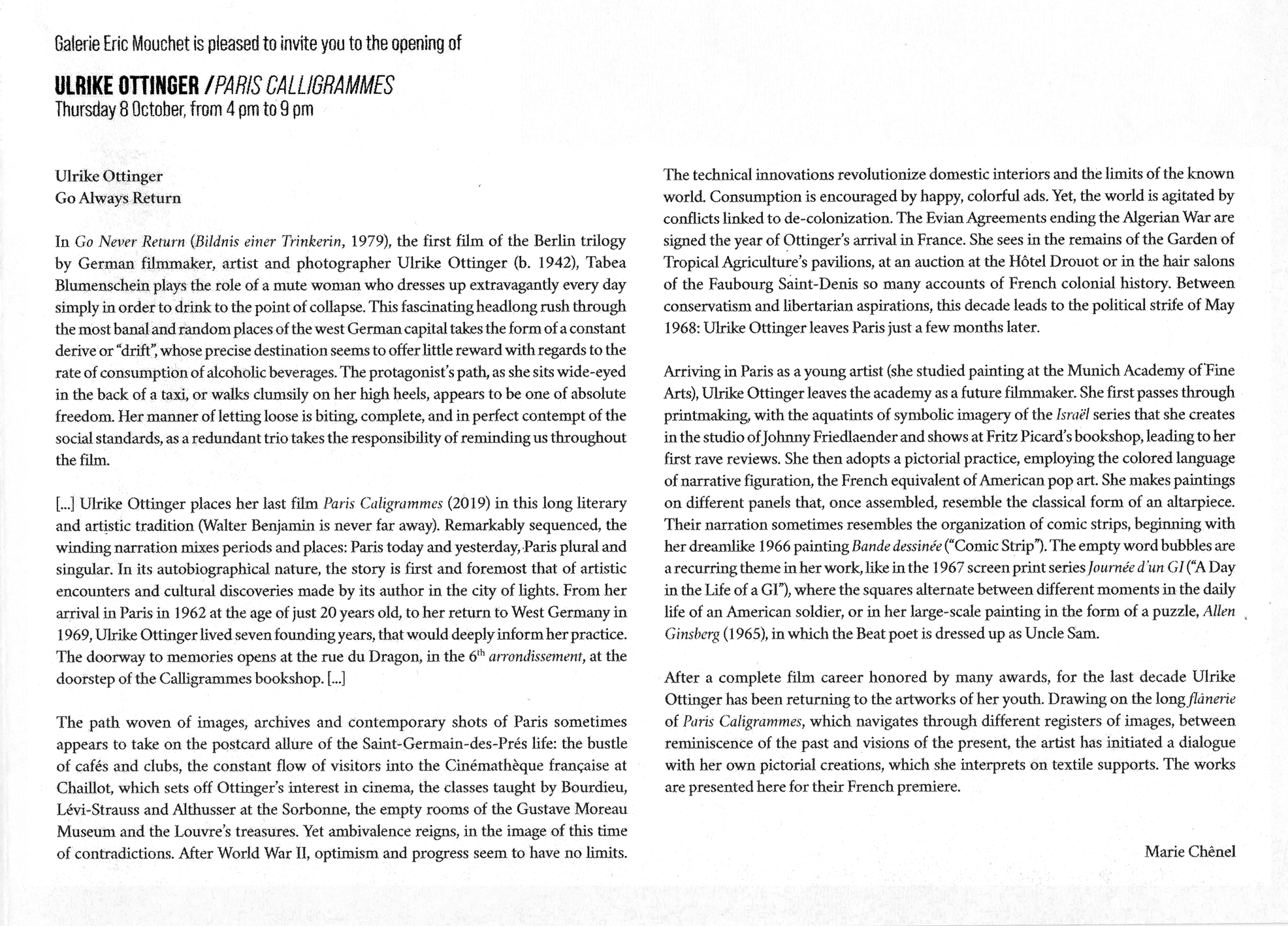 In Ticket of No Return (Bildnis einer Trinkerin, 1979), the first film of the Berlin trilogy by German filmmaker, artist and photographer Ulrike Ottinger (b. 1942), Tabea Blumenschein plays the role of a mute woman who dresses up extravagantly every day simply in order to drink to the point of collapse. This fascinating headlong rush through the most banal and random places of the west German capital takes the form of a constant derive or “drift”, whose precise destination seems to offer little reward with regards to the rate of consumption of alcoholic beverages. The protagonist’s path, as she sits wide-eyed in the back of a taxi, or walks clumsily on her high heels, appears to be one of absolute freedom. Her manner of letting loose is biting, complete, and in perfect contempt of the social standards, as a redundant trio takes the responsibility of reminding us throughout the film.Ulrike Ottinger places her last film Paris Calligrammes (2019) in this long literary and artistic tradition (Walter Benjamin is never far away). Remarkably sequenced, the winding narration mixes periods and places: Paris today and yesterday, Paris plural and singular. In its autobiographical nature, the story is first and foremost that of artistic encounters and cultural discoveries made by its author in the city of lights. From her arrival in Paris in 1962 at the age of just 20 years old, to her return to West Germany in 1969, Ulrike Ottinger lived seven founding years, that would deeply inform her practice. The doorway to memories opens at the rue du Dragon, in the 6th arrondissement, at the doorstep of the Calligrammes bookshop.