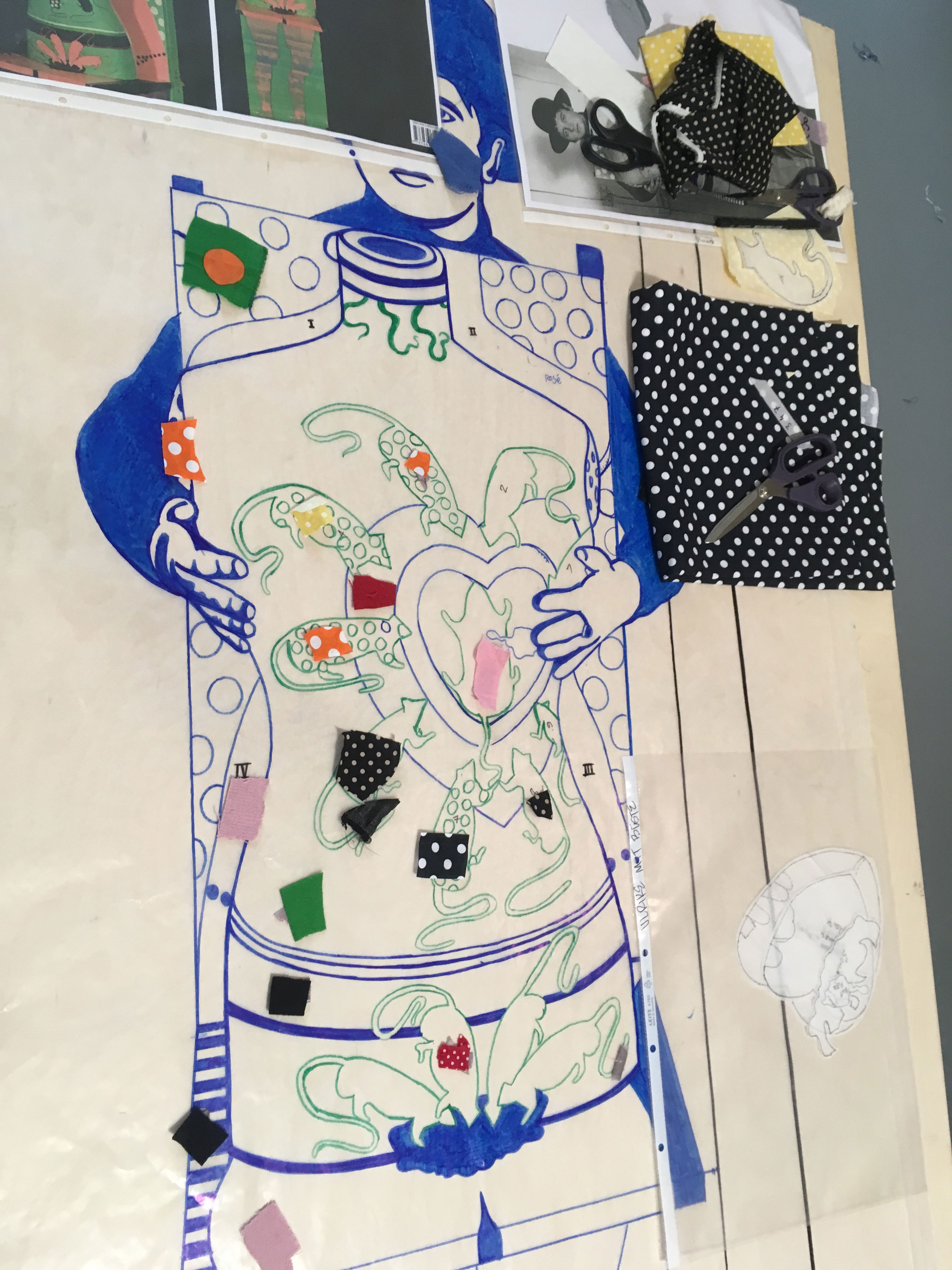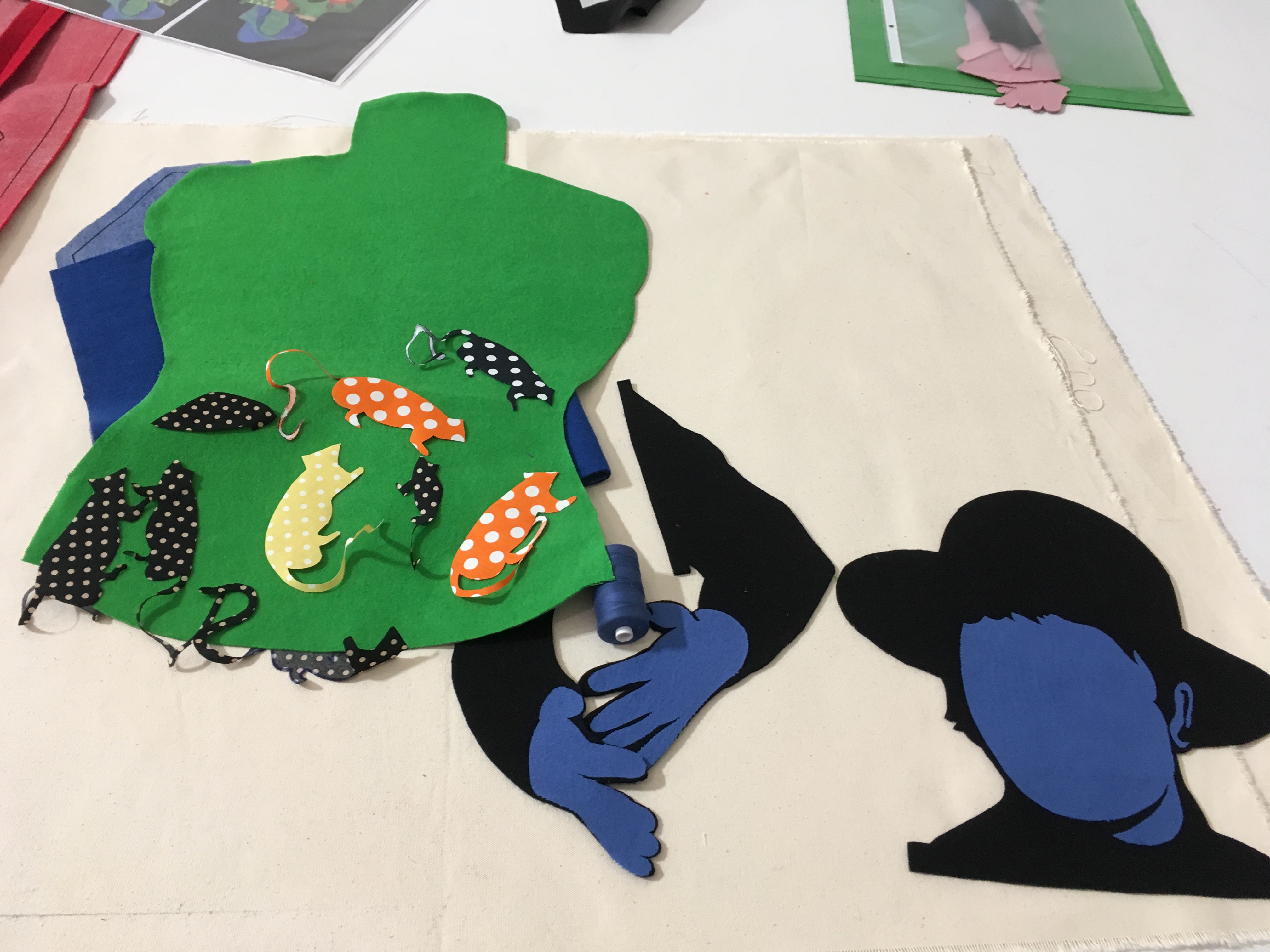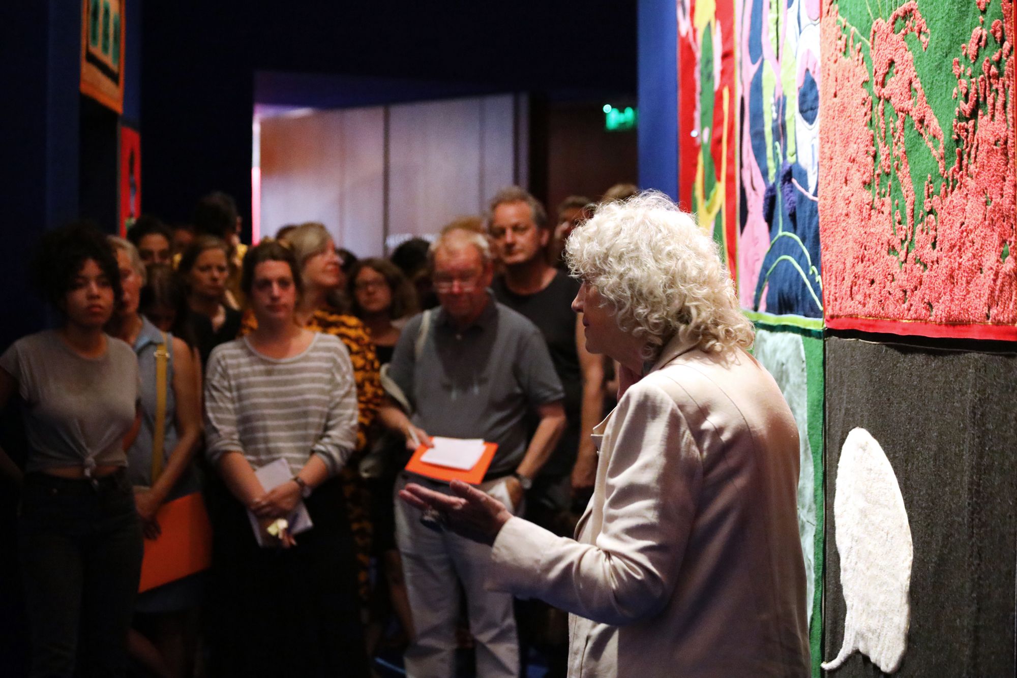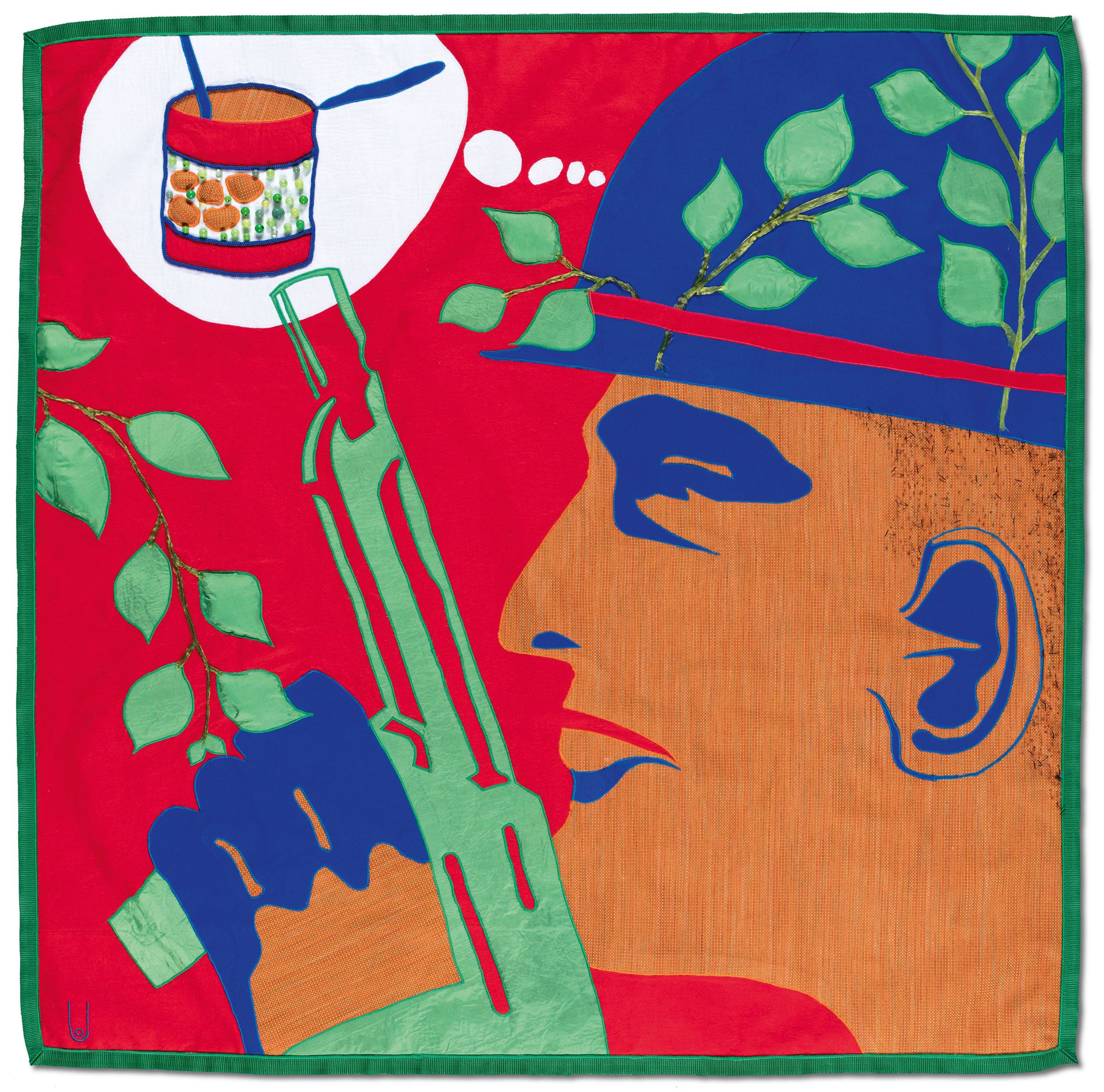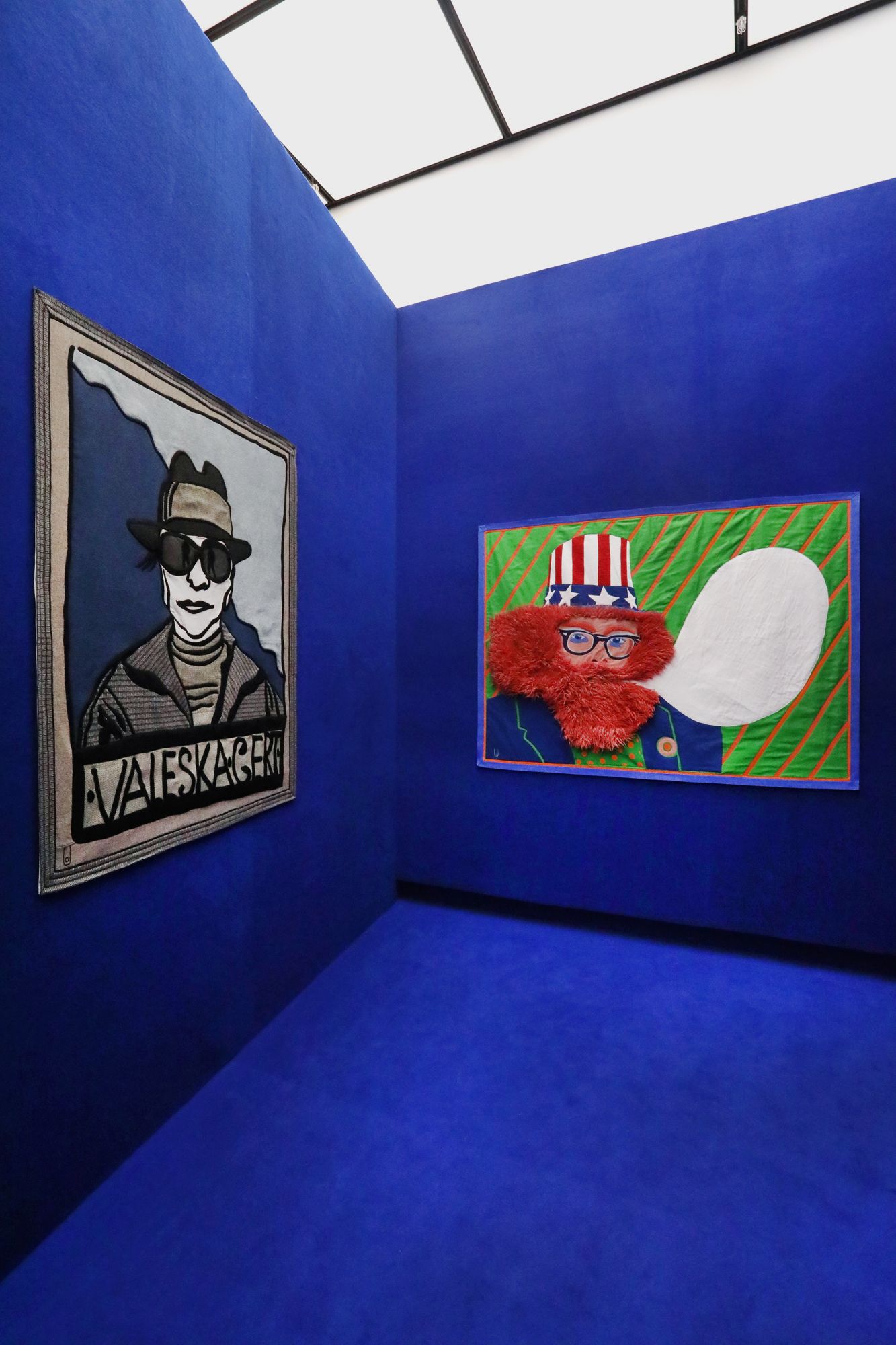 Paris Calligrammes is my personal memory landscape of this time, translated into the spatial. Photos, films, newspaper cuttings, sounds and music have been combined to create a dense assemblage of memory fragments. Their integration into an urban structure composed of soft textiles tells of the changes that the past undergoes on the path of memory. Streets with Pop Art paintings—in which I engaged with war and consumer culture—translated into fabric collages, point the way to spaces which were important fixed points for me: With Fritz Picard, the book dealer of the Librairie Calligrammes, and Walter Mehring, the sharp-tongued exiles, you enter my Parisian world of books. In the Parc Colonial you encounter the traces of French colonial history, or you follow Pierre Bourdieu and Ré Soupault on their precarious journeys to Algeria and Tunisia. Wherever you start or finish your little stroll there is one thing you should not miss: In the streets around today’s Gare du Nord you can observe the art of plaiting hair in the best hairdressers in the district; the results are also modern figure poems, in which history and the present, art and political statement condense.
