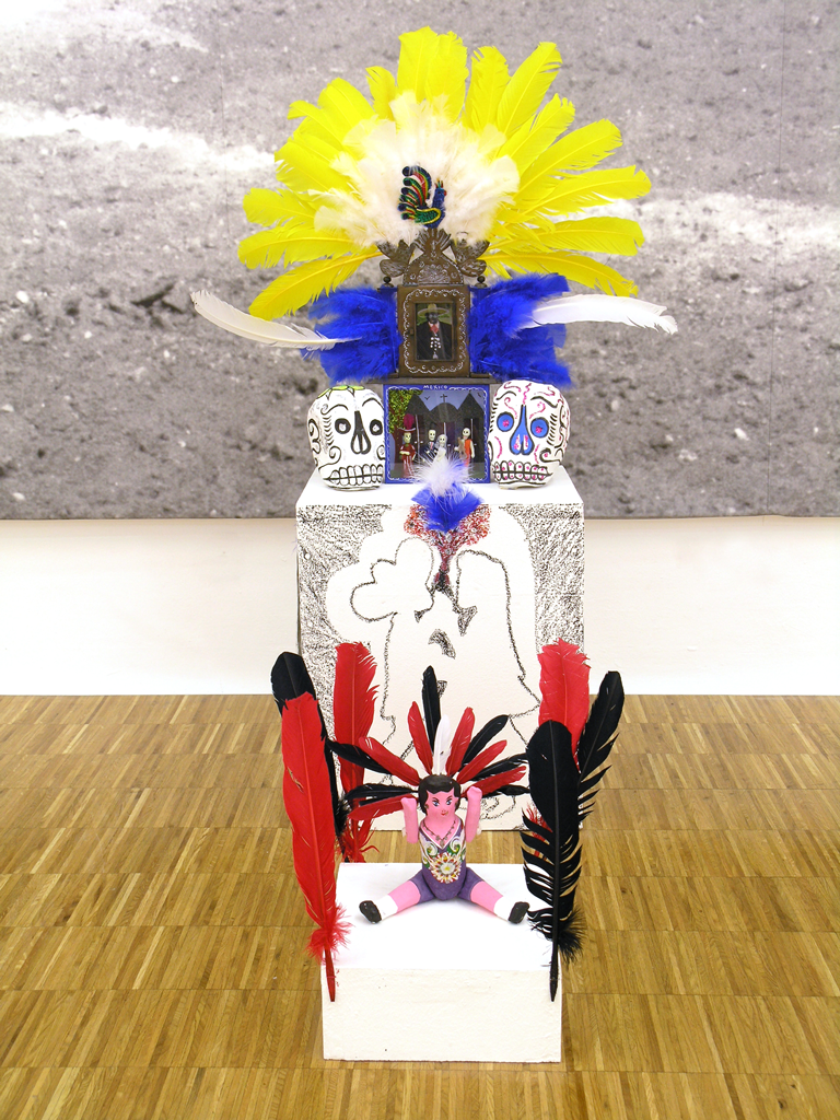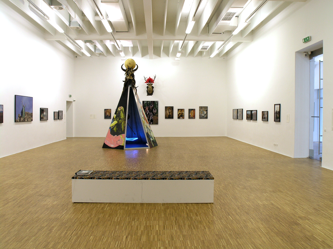 Spatial Installation: Europa und der Stier (1987), Tent object with 6 varied side elements, pastels, oil and acrylic painting, hide and photographs and interior with an assemblage of blue silk, blue neon triangle, magic wand, eagle feathers, crowned with a golden disc on crescent horns, sheep horns and wool; Photographs from the contexts of the films Freak Orlando (1981), Dorian Gray in the Mirror of the Yellow Press (1983), Taiga (1991/92); Treated stag´s antlers; Bildarchive (2004), Slide installation with four projectors and oriental divan; Assemblages of objects, colour photos, drawings, paper, cardboard wood, fabric as well as photographs and the workbook from the context of the exhibition FACES, FOUND OBJECTS, AND ROUGH RIDERS (2004).