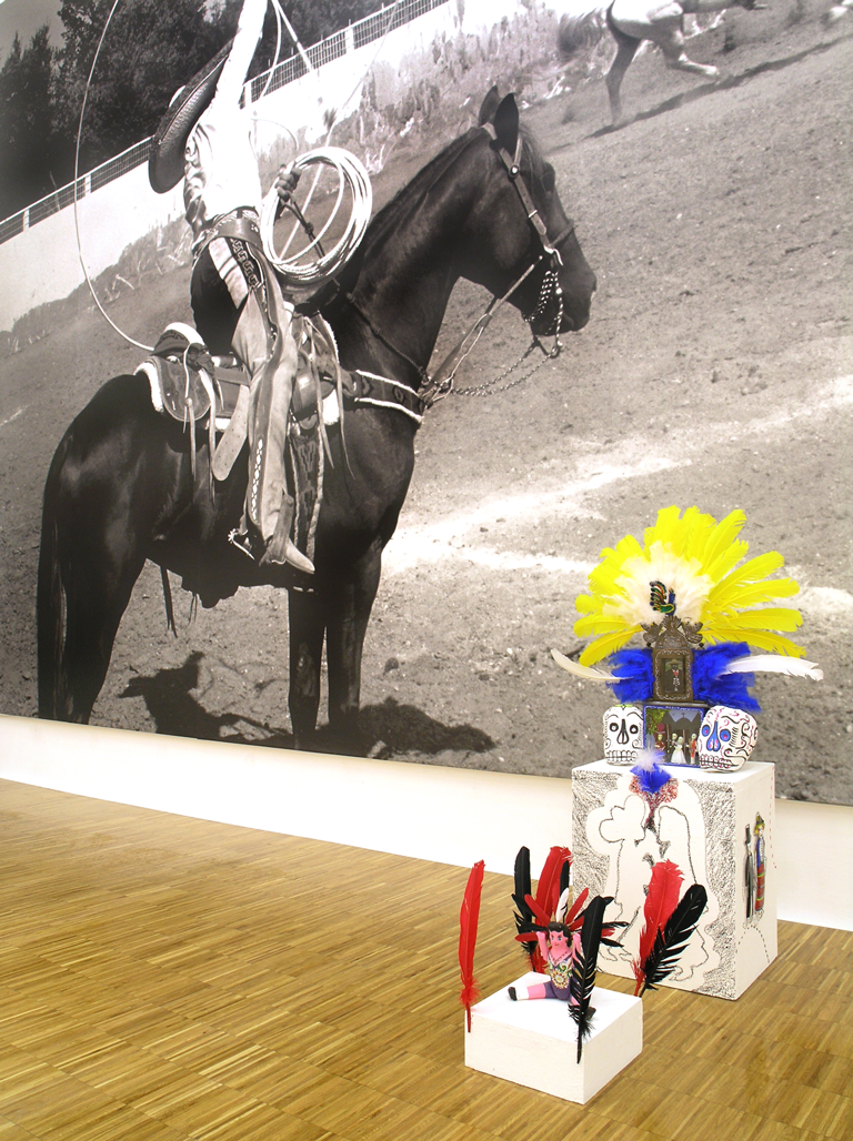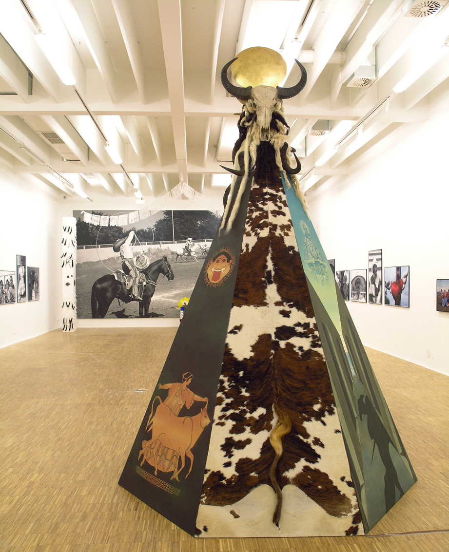 TOTEM contains elements from the exhibition installed by Ottinger at San Antonio, FACES, FOUND OBJECTS, AND ROUGH RIDERS, as well as photographs from Mongolia and the EuropaTotem of 1986, which was first exhibited at the Tropenmuseum in Amsterdam in 1987. A tent over four meters high, with six closed and one open surface, shows depictions of the myth of "Europa and the Bull" from Antiquity up to the precursors of Surrealism, and a photograph of a contemporary abattoir scene. In the Berlin studio of her friend Wolf Vostell. Ottinger worked for months on the production of this "recreation of an archaic cultic site", where, according to Katharina Sykora, a fundamental promise of the myth (appears); it derives from the animalistic idea that all the things and creatures invariably have a soul."*