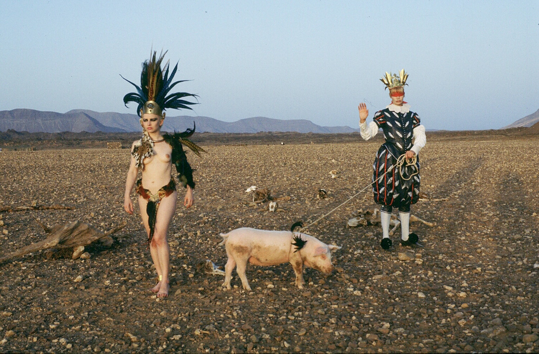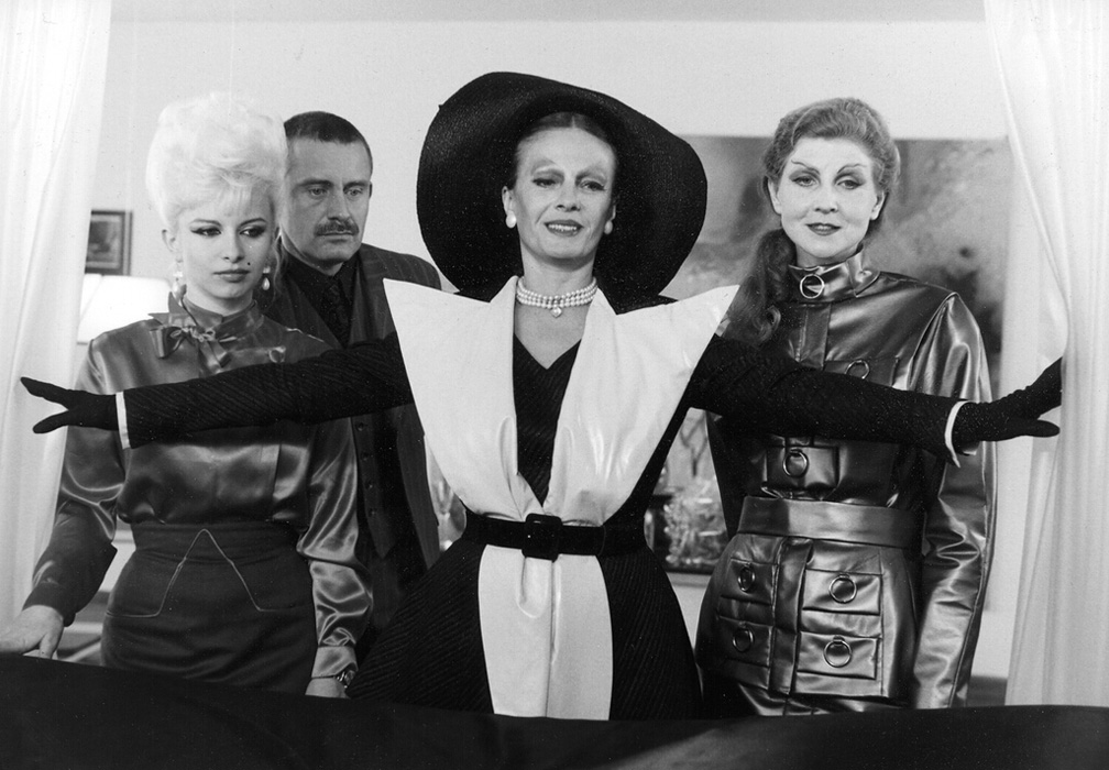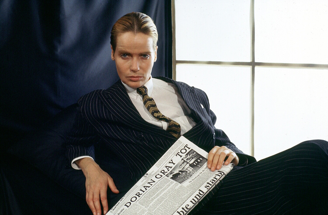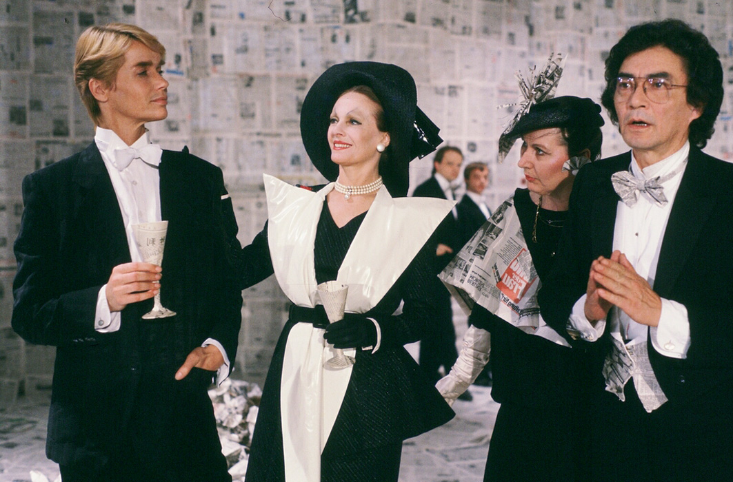 Structurally, repetition is located in the episodic excess of the narrative. The recurring images of groups of three women, for example, function both decoratively and symbolically, but do not participate in plot-related action. Mabuse's three female aids - Susy, Passat and Golem - are the stylish backdrop to the tycoon's actions and at the same time represent the whole host of techno- and bureaucrats that uphold the enormous media concern. The corresponding trio in the opera section are the three goddesses of fate, played by the same actresses. They help Dorian with the difficult process of memory, a process which takes him through the "sea of stones", until, at the furthest recess of this journey, he happens upon a scene of taboo-breaking: a kosher butcher is handing to the child Dorian the skinned head of a pig. The force of this transgression of the Law catapults Dorian into two awakenings. First, the child Dorian wakes up to the adult Dorian still holding the rope and the pig's head. (The image also brings full circle the departure scene of the prince/Dorian in the opera, where he sets out onto the "sea of stones," his vision obstructed by a cloth tied over his eyes and equipped with a guide: a pig tethered to a rope.) And, second, the adult Dorian wakes up from his opium dream to the world of Dr. Mabuse.